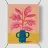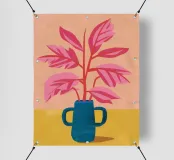 Un'illustrazione semplice ma d'effetto di una pianta dalle foglie rosa in un audace vaso blu su uno sfondo caldo, che celebra la bellezza del colore e della forma botanica minimalista.