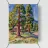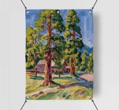 Due pini alti e maestosi si ergono come sentinelle in una radura illuminata dal sole, con le loro forme forti e i ricchi aghi verdi dipinti con una qualità grafica audace contro un cielo luminoso.