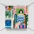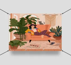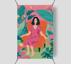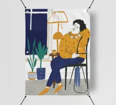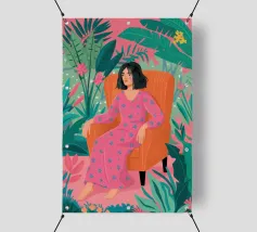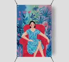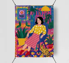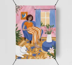 Questa opera d'arte raffigura una persona seduta in una stanza colorata che indossa abiti a righe. Lo sfondo comprende varie piante e mobili, creando un ambiente accogliente e sereno.