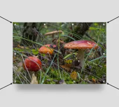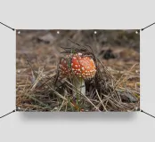Una piccola mosca agarica fa capolino dal suolo della foresta, emergendo da una coltre di aghi di pino: la sorpresa silenziosa della natura.