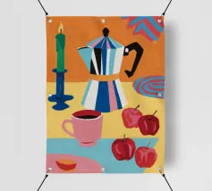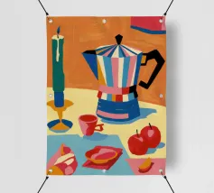 Una caffettiera e una tazza poggiano su una superficie arancione vivace, in contrasto con il rosa e il rosso a strisce, irradiando tranquillità.
