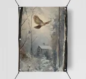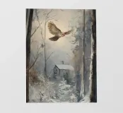 In una tranquilla foresta innevata, un gufo plana silenzioso su una capanna solitaria. I colori tenui e la luce soffusa conferiscono alla scena un'atmosfera misteriosa e pacifica. Questo suggestivo dipinto invernale cattura la bellezza della natura e la magia della solitudine invernale, simbolo di tranquillità e contemplazione.
