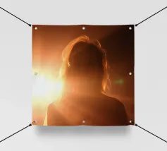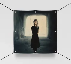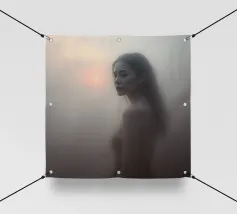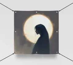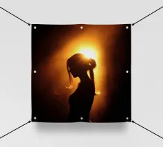 Una donna se ne sta tranquilla con le mani giunte davanti a sé, circondata da un bagliore etereo che ne evidenzia la silhouette nelle serene ore del crepuscolo.