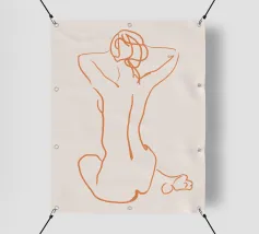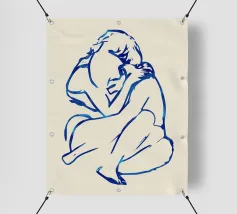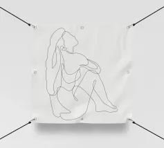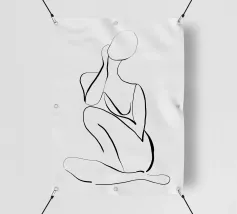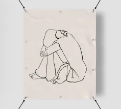 Un semplice disegno al tratto raffigura una persona seduta con i capelli ricci, le braccia avvolte intorno alle ginocchia. Lo stile minimalista utilizza linee morbide e fluide per trasmettere un senso di calma e introspezione.