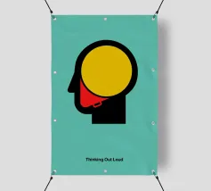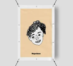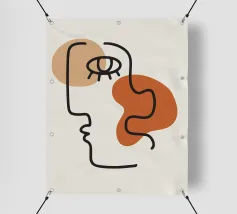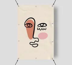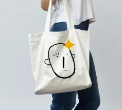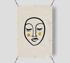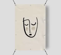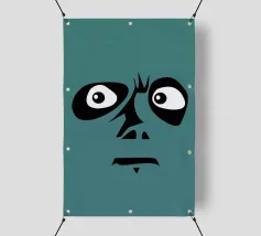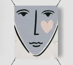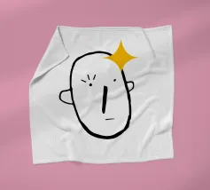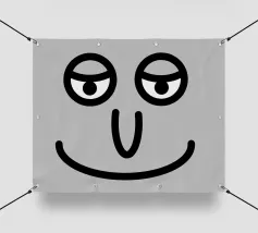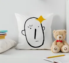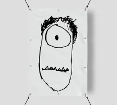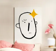 Un volto semplicistico e astratto è disegnato con linee nere decise e presenta una stella gialla sulla fronte. L'espressione è minimale, con piccoli punti per gli occhi e una linea retta per la bocca.