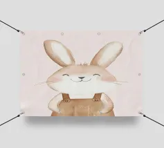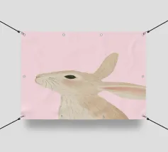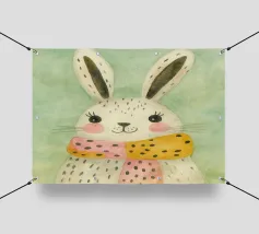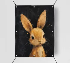 Un simpatico coniglio bianco con orecchie nere su uno sfondo marrone risplende nei colori della terra e porta un'affascinante naturalezza in ogni casa.
