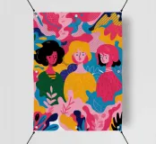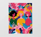 Un'illustrazione bella e potente raffigura un gruppo eterogeneo di donne, i cui volti e capelli si intrecciano con una vibrante esplosione di fiori colorati, celebrando la sorellanza, la diversitร  e la crescita.