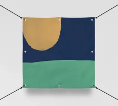 Domina uno stile minimalista con ampie fasce di colore blu, verde e viola, separate da linee rette per creare una composizione segmentata. L'elemento centrale ricorda un paesaggio stilizzato con un primo piano, un orizzonte e un cielo semplificati.
