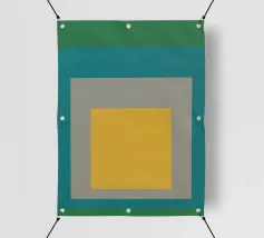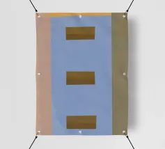 Diverse forme geometriche dai colori tenui sono sovrapposte a uno sfondo chiaro. Un rettangolo color oliva opaco domina una parte della tela, sovrapponendosi parzialmente a una forma giallo pallido, con un accenno di blu che fa capolino da sotto.