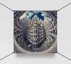 Un intricato edificio abbandonato presenta archi ornati e stratificazioni labirintiche con texture in decadenza sotto una luce naturale diffusa. Il design simmetrico e i dettagli rovinati dalle intemperie evocano mistero e profondità storica in questo ambiente architettonico surreale.
