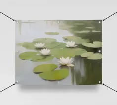Ritratto paesaggistico di uno stagno di ninfee con ponte.