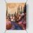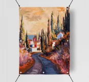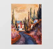 Una strada tortuosa fiancheggiata da alti cipressi è immersa nella calda luce dorata del crepuscolo; lo stile espressivo e pittorico crea un viaggio sognante e romantico attraverso la campagna.
