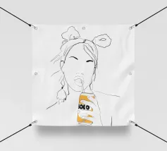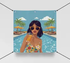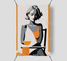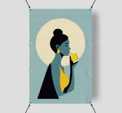 Un'illustrazione audace ed elegante di una donna che sorseggia una bevanda fresca sotto l'alone luminoso del sole. La tavolozza di colori retrò, verde acqua e oro, dona calore, energia e personalità a qualsiasi ambiente. Ideale per cucine, caffè, bar e spazi moderni e luminosi.