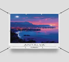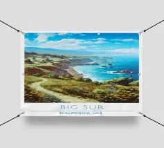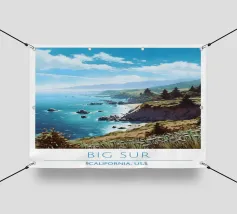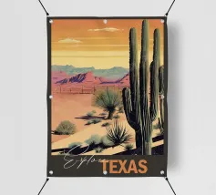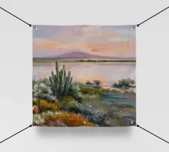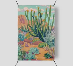 Un'illustrazione paesaggistica vivida e suggestiva di un deserto pieno di cactus che si affaccia su una drammatica vista costiera al tramonto. Le scogliere dorate e le piante di agave dai toni violacei contrastano splendidamente con l'oceano turchese e il cielo luminoso. Quest'opera d'arte cattura la bellezza selvaggia dei paesaggi aridi che incontrano il mare, perfetta per gli amanti della Baja California, dell'Arizona o delle vibrazioni del deserto mediterraneo. Una stampa murale di grande effetto per interni boho, per gli amanti della natura o per l'arredamento di una casa al mare.