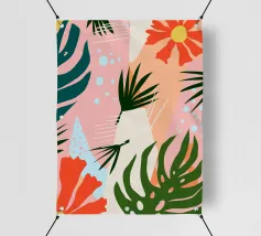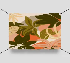 Un'elegante composizione di foglie botaniche stilizzate nei toni tenui dell'arancio, del verde e della terracotta, su uno sfondo rosa e beige per un'atmosfera moderna e terrena.