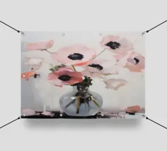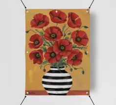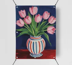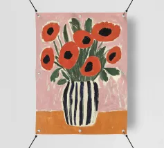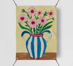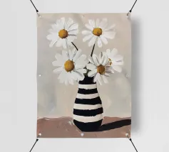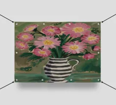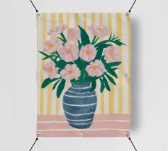 Questa illustrazione minimalista mostra un'elegante tazza di ceramica a righe bianche e nere, circondata da fiori rosa e foglie verdi. Sullo sfondo beige, l'allegro bouquet di fiori irradia leggerezza estiva e porta la freschezza botanica in ogni stanza!