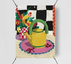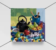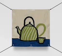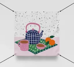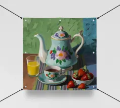 Una natura morta calma e composta di una teiera verde e blu e di una tazza rosa appoggiate su un panno a righe bianche e blu. I limoni a fette aggiungono un tocco di freschezza a questa serena e invitante scena dell'ora del tè.