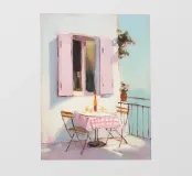 Il motivo raffigura un'affascinante scena di balcone mediterraneo in tenui colori pastello. Un tavolino con una tovaglia rosa, due sedie e una bottiglia invitano a soffermarsi al sole. Le pennellate morbide e la luce calda trasmettono una sensazione di estate, leggerezza e vacanze al mare.