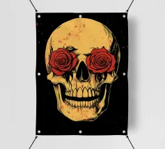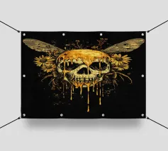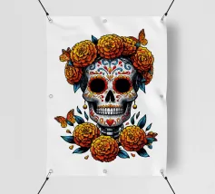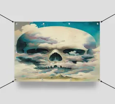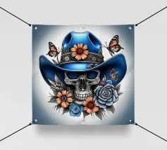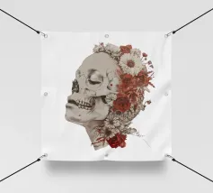 Un teschio realistico è abilmente circondato da fiori e grandi ali di farfalla. L'armoniosa palette di colori blu, rosa e beige crea un contrasto poetico tra vita e caducità.
