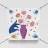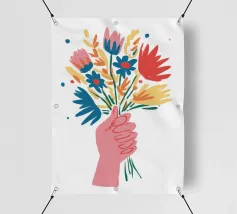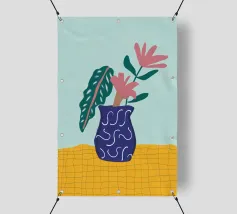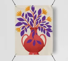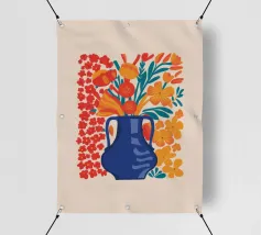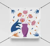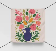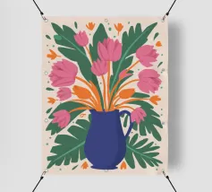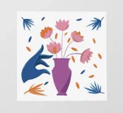 Illustrazione minimalista ed elegante di una mano blu scuro che dispone delicati fiori e foglie rosa in un vaso viola.