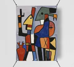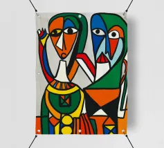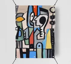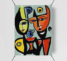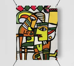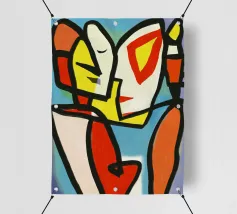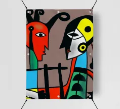 Due figure stilizzate dominano la composizione, caratterizzate da forme astratte e colori vivaci. Una figura appare di profilo mentre l'altra è rivolta in avanti, entrambe con tratti esagerati e una qualità stravagante.