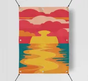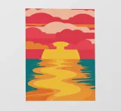 Una rappresentazione drammatica e minimalista di un tramonto sull'oceano, con un sole cremisi che si riflette sull'acqua. I colori decisi e le forme semplici creano una scena potente e suggestiva.