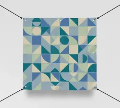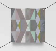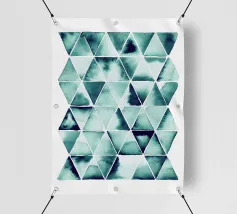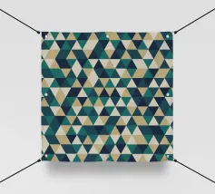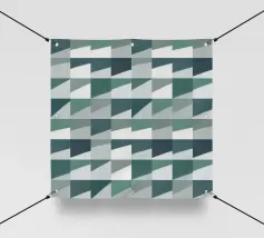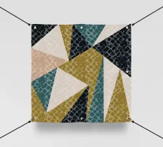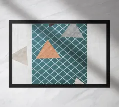 Le forme geometriche sono disposte su uno sfondo strutturato, caratterizzato da un motivo a griglia verde acqua. I triangoli di varie tonalità creano un contrasto visivo dinamico.