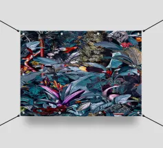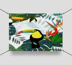 Questo elegante collage vintage è incentrato su un sorprendente tucano, il cui becco vibrante e le piume nere e lucide spiccano sul lussureggiante fogliame tropicale. Intorno al tucano si librano con grazia delicati colibrì, le cui ali iridescenti brillano nelle tonalità del blu e del verde. L'interazione tra l'audace presenza del tucano e il movimento leggero ed etereo dei colibrì crea una scena dinamica e armoniosa. Lo sfondo, con le sue sottili texture vintage, aggiunge profondità e un fascino nostalgico, mentre la ricca vegetazione e i colori vivaci evocano la bellezza di un paradiso esotico.