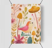 Un dolce uccellino rosa si trova tra funghi dorati e fiori soffici in questo giardino boho da sogno. Dipinta in calde tonalità di acquerello, l'opera d'arte fonde la dolcezza del capriccio e la calma della natura, perfetta per le pareti di asili nido, salotti accoglienti o per chiunque ami il fascino morbido e moderno delle fiabe. Portate un tocco di magia e serenità nel vostro spazio con questa stampa pastello del bosco.