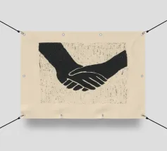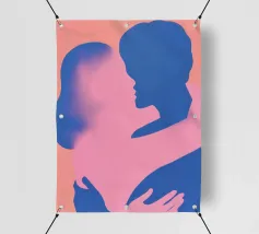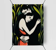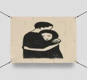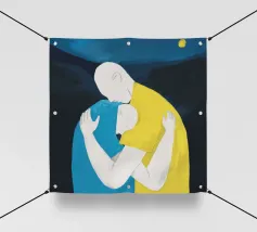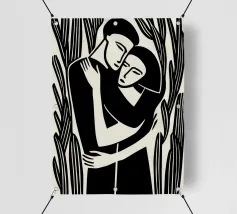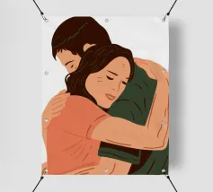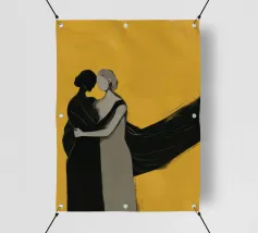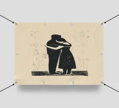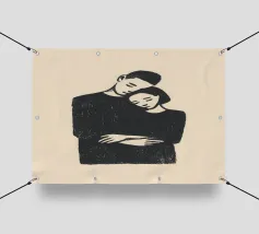 Due sagome si abbracciano in stretta e silenziosa vicinanza. Minimalista in nero su sfondo chiaro, la composizione cattura l'affetto, la sicurezza e l'intimità emotiva. Le linee chiare sottolineano l'armonia e il calore del momento.