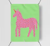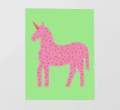 Questa giocosa illustrazione mostra un unicorno rosa con puntini su uno sfondo arancione e verde, perfetto per le camere dei bambini o per le decorazioni estive. La grafica dipinta a mano combina elementi fantasiosi con un design minimalista e crea un'atmosfera allegra che irradia gioia e creatività.