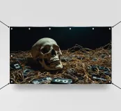 Un teschio umano è in primo piano, circondato da musicassette vintage sparse sulla paglia, creando un'atmosfera inquietante piena di nostalgia e di intrighi.