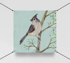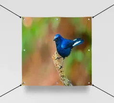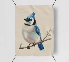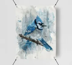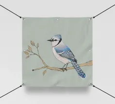 La ghiandaia azzurra siede con grazia su un ramo robusto, con le sue piume bianche e blu che contrastano con lo sfondo del fogliame verde nella luce del mattino.