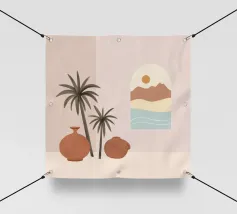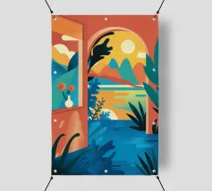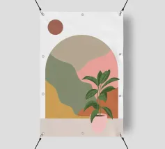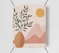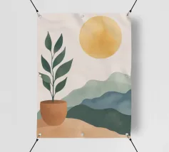 Una composizione minimalista presenta un vaso con una pianta verde davanti a una finestra ad arco, che mostra un paesaggio sereno con montagne, sole e lago in toni tenui. Le calde tonalità del marrone e del rosa creano un'atmosfera naturale e rilassante.