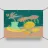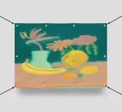 Un dipinto astratto mostra un vaso turchese chiaro con fiori rosa su uno sfondo color pesca. I frutti gialli - limone e banana - fanno da contrasto. Le pennellate spesse e i colori vivaci conferiscono all'opera profondità e consistenza.