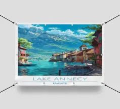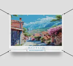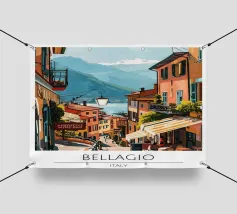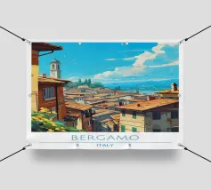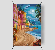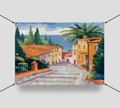 Una veduta prospettica di una strada europea stretta e tortuosa, fiancheggiata da edifici colorati, piante in vaso e diretta verso un cielo luminoso e nuvoloso.