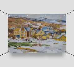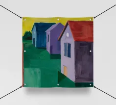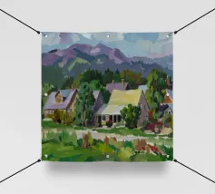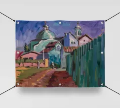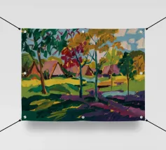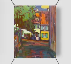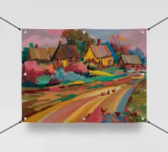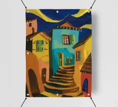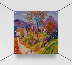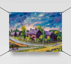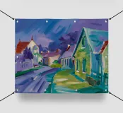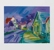 Un dipinto espressionista di una strada di paese, caratterizzata da case dai colori vivaci nei toni del verde, del blu e del bianco, con una suggestiva strada viola che conduce lo sguardo, il tutto sotto un cielo luminoso ed energico.