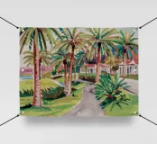 Una villa bianca e immacolata con il tetto di tegole rosse è incastonata tra palme maestose, un vialetto curvo conduce l'occhio in questo sereno e lussuoso ambiente tropicale o mediterraneo.