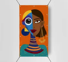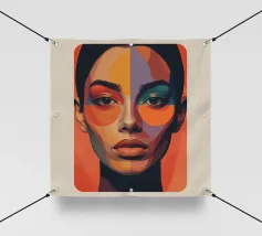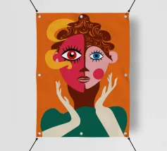 Un suggestivo ritratto astratto di un volto di donna, diviso in due metà, una nera e una bianca, con labbra rosse e capelli fluenti su un caldo sfondo arancione.