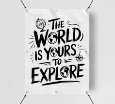 "Il mondo è tuo!" - Un avventuroso motivo estivo nelle vivaci tonalità del rosa, del rosso e dell'arancione. Questo disegno tipografico ispira viaggi ed esplorazioni, mentre il carattere audace incarna libertà e possibilità.