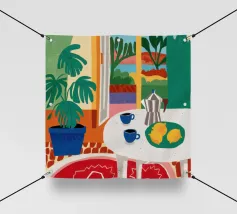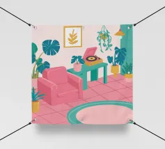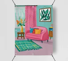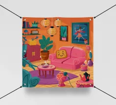 Un'illustrazione vivace di un soggiorno eclettico e massimalista con mobili colorati, una parete a galleria, numerose piante d'appartamento e un tappeto viola.