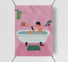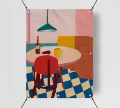 Un'illustrazione umoristica per il bagno degli ospiti: "Siediti, non fare pipì in piedi!". - in colori pastello e design minimalista delle piastrelle, perfetto per un bagno moderno.
