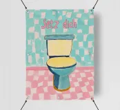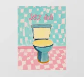 Un biglietto illustrato umoristico per il bagno degli ospiti: "Siediti, non fare pipì in piedi!". - in colori pastello e design minimalista, perfetto per un bagno moderno.