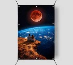 Vivevamo lì. Ricordate? Quel mondo ci sta ancora aspettando. ~ Coppia seduta su una panchina che guarda la Terra surreale retro futuristico stellato composizione romantica. versione orizzontale