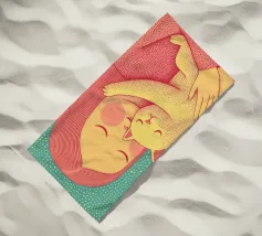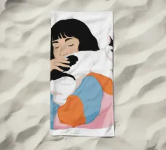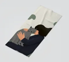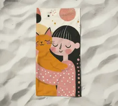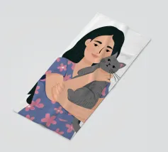 Una commovente illustrazione di una donna con una camicia a righe, con gli occhi chiusi, che abbraccia amorevolmente un grosso gatto rosso. Lo sfondo di piante in vaso contribuisce a creare un'atmosfera accogliente, da "genitore di piante e animali".