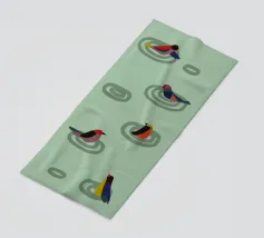 applicazioni. Caratterizzato da uccelli vivaci che fluttuano su un morbido sfondo verde, questo disegno unisce colori audaci a un'estetica minimalista, rendendolo ideale per l'arte murale, la carta da parati, la biancheria da letto, i cuscini e i tessuti per la casa. Ispirata all'arredamento scandinavo e moderno di metà secolo, questa stampa unica aggiunge un tocco di natura ed eleganza a qualsiasi spazio abitativo, cameretta o ambiente creativo.