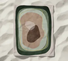 Forme astratte in tonalità terrose creano una composizione armoniosa con forme fluide e contrasti decisi. Curve organiche e macchie di ocra, marrone e oliva costituiscono il motivo centrale.