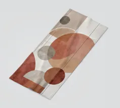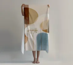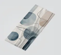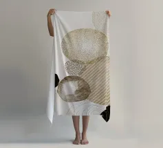Un design astratto di grande impatto, caratterizzato da un armonioso gioco di forme circolari in oro metallizzato, blu profondo, pesca tenue e beige tenue. Questa composizione minimalista combina elementi geometrici audaci con delicate linee verticali, creando un senso di equilibrio ed eleganza. Le sottili texture e gli spruzzi d'oro aggiungono profondità e raffinatezza, rendendo questo pezzo un centro perfetto per gli interni moderni e contemporanei.