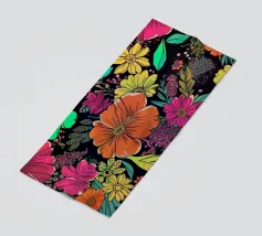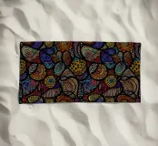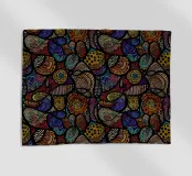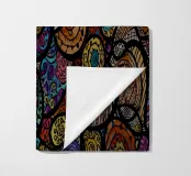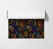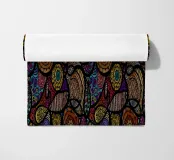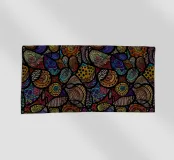 Un audace e vibrante motivo astratto con cerchi colorati, vortici e forme geometriche in ricche tonalità gioiello tra cui verde acqua, arancione, viola, giallo, magenta e marrone su sfondo nero. Questo energico disegno si ispira ai modelli tessili africani e all'arte etnica con la sua disposizione dinamica di motivi decorativi. Perfetto per gli amanti dell'arte culturale, per gli appassionati di motivi audaci e per tutti coloro che apprezzano i disegni vibranti di ispirazione etnica con il massimo impatto cromatico.