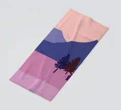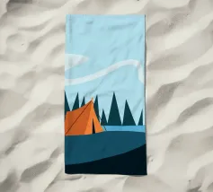 Illustrazione paesaggistica minimalista di una regione glaciale in Alaska: foreste di pini scuri, montagne innevate e una piccola tenda in primo piano. Questo poster cattura la natura selvaggia, la tranquillità e lo spirito avventuroso della natura nordamericana.